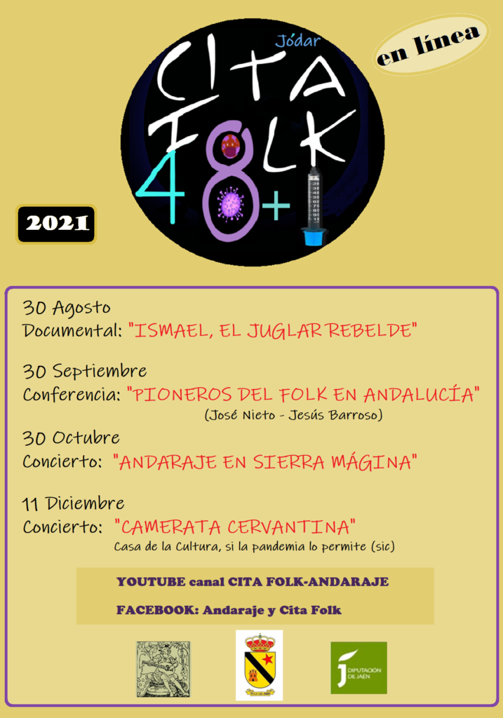 Como ya se publicó en su día, la CITA del año pasado quedó suspendida por causa de la pandemia; por eso, a la de este año la hemos nombrado como la edición nº 48 + 1 de la CITA con la Música FOLK, el festival más antiguo del Sur de Europa, que se celebra en Jódar (Jaén), y que tendrá lugar a lo largo del último cuatrimestre de este año. Ese es el acuerdo entre el Ayuntamiento de Jódar, organizadores del festival, y el grupo ANDARAJE, directores artísticos del mismo: será “en línea”, casi en su totalidad, siguiendo las medidas anti Covid-19.
