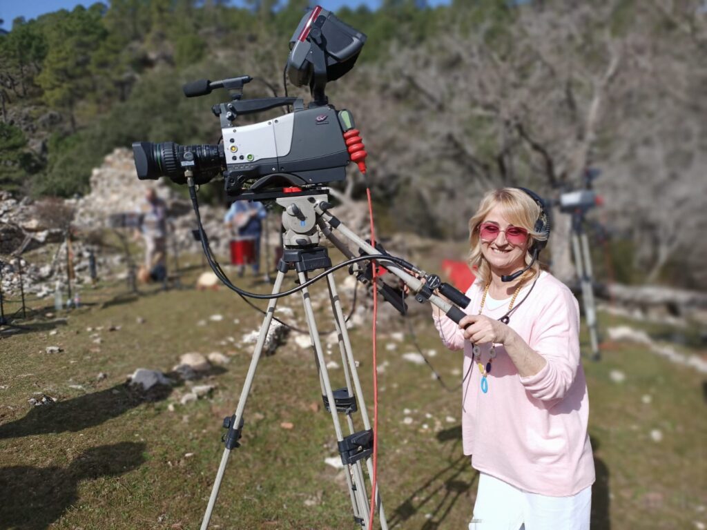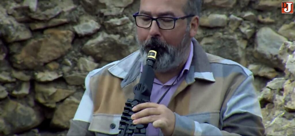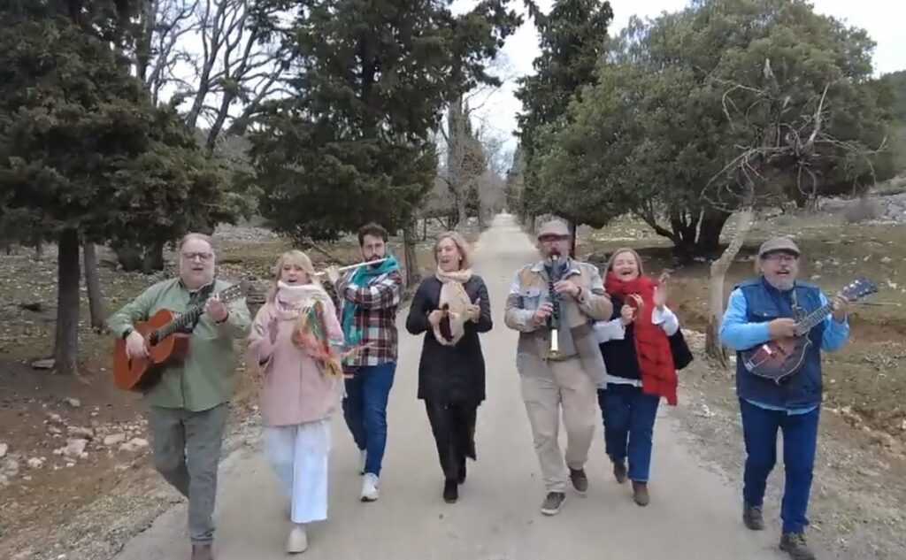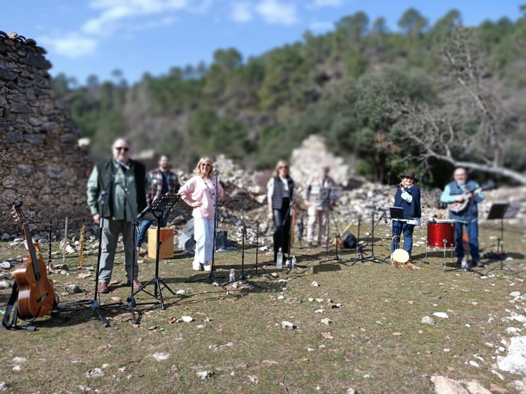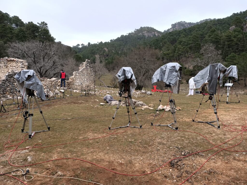 En la segunda sesión de las grabaciones, ya después del parón para tomar un bocadillo, con un pan crujiente buenísimo, oscuros nubarrones hicieron acto de presencia en aquellas sierras asomando por sus cumbres y , mire usted qué casualidad, tras cantar unas rogativas pidiendo agua para los campos, la providencia tuvo a bien concedernos el deseo y comenzó la lluvia; todo fueron carreras para proteger los instrumentos musicales, delicados, las cámaras de televisión y el dron, más delicados ellos aún, y no digamos el equipo de sonido, con el riesgo añadido de las posibles descargas eléctricas. En resumen, grabación interrumpida y muy probablemente suspendida del todo. Por lo pronto, parón.