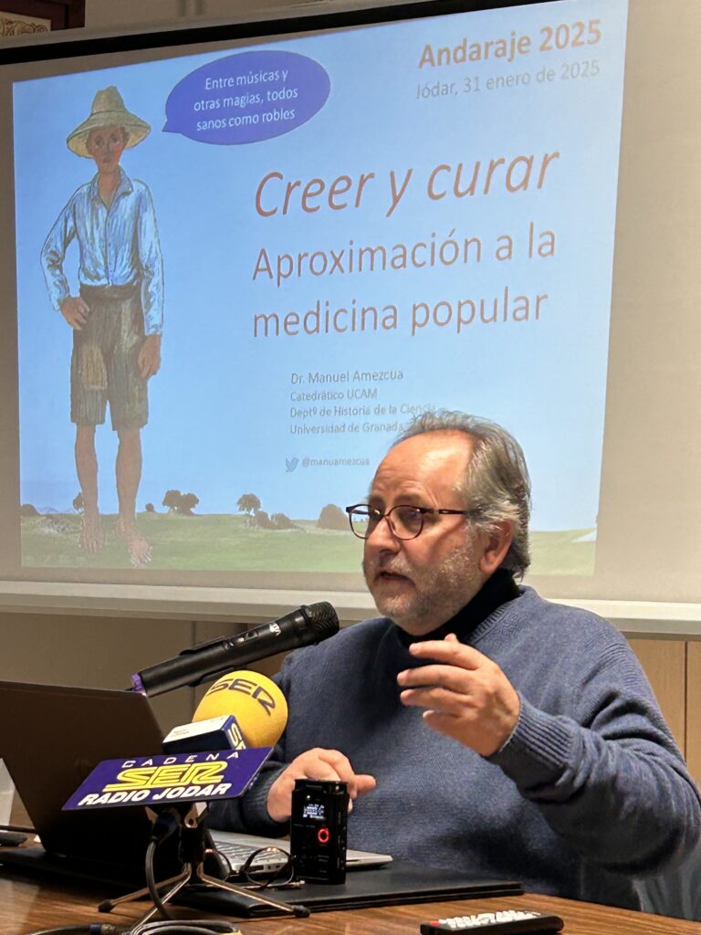 La primera de ellas fue una conferencia que corrió a cargo de don Manuel Amezcua Martínez, quien nos introdujo en el ámbito de la folk medicina y sus implicaciones con las creencias, santería, mujeres sabias… “Creer y sanar: aproximación a la medicina popular” era el sugestivo título de una charla amenísima con la que inauguramos el ciclo de actividades paralelas de nuestra Cita Folk en su edición quincuagésimo tercera.