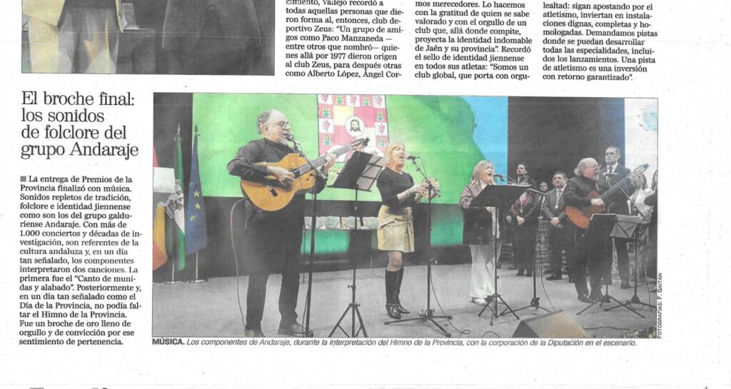 En el acto de clausura, ANDARAJE, fue el encargado de interpretar el HIMNO DE LA PROVINCIA DE JAÉN, con todos los asistentes en pie, tras lo que se procedió a inaugurar oficialmente la Feria de los Pueblos.